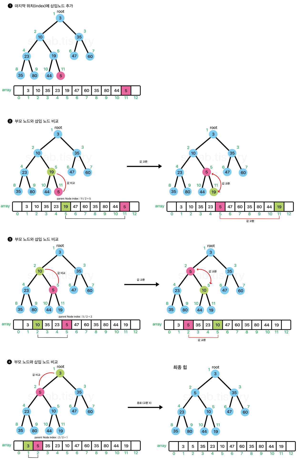 최소값이 root 자리로 왔냐 최대값이 root 자리로 왔냐로 보면 되겠다.